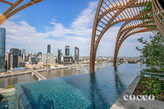 The second rooftop level hosts the Upper Club, featuring a Residents Wine Bar and Lounge, Private Dining Room, Private Theatre Room, and Resident Wine Cellar. Additionally, the Upper Club offers an Executive Board Room, Work from Home office, and Library Spaces. Enhance your Aria living experience with a dip in the exquisite infinity pool, providing stunning views of the cityscape and river.